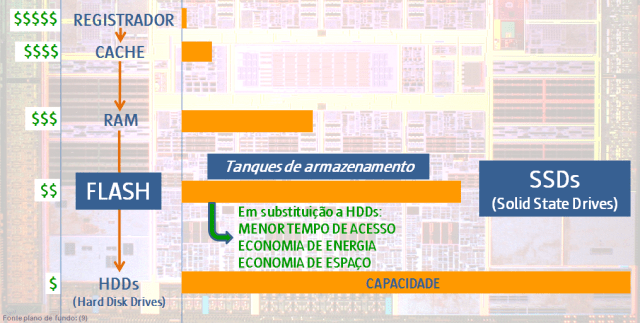 Entretanto, está para se popularizar mais um nível de armazenamento: os SSDs (memória não-volátil), com exatamente o mesmo funcionamento do seu pendrive. Ela fica entre os discos rígidos e a memória RAM (veja a imagem abaixo), com o objetivo de armazenar aquela taxa de dados que a memória já quer gravar (passar para os discos) mas que os discos não são capazes de fazê-lo. São como um “buffer” da RAM para os HDDs. Não digo que seja essencial. O CESUP, por exemplo, ainda não tem. Para se ter uma referência, a taxa de escrita em disco do CESUP era, em 2009, de 800 MB/s.