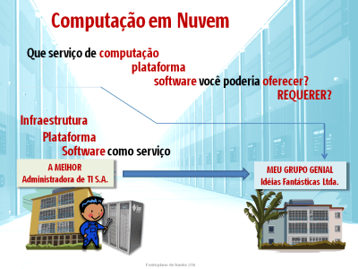Bom, se achas que tudo isso dá muito trabalho, uma alternativa é contratar um serviço de computação em nuvem. Ao invés de investir em um cluster, administração e manutenção, pode-se deixar tudo isso com especialistas no assunto (fornecedores de infraestrutura de computação como serviço) (veja imagem abaixo). Isso não é nada além do que o SINAPAD faz: um recurso computacional como serviço. O laboratório poderia, ainda, procurar um outro serviço que prove ser mais adequado. Infelizmente, além dos centros do SINAPAD, do qual o CESUP faz parte, não conheço nenhum voltado à computação científica.